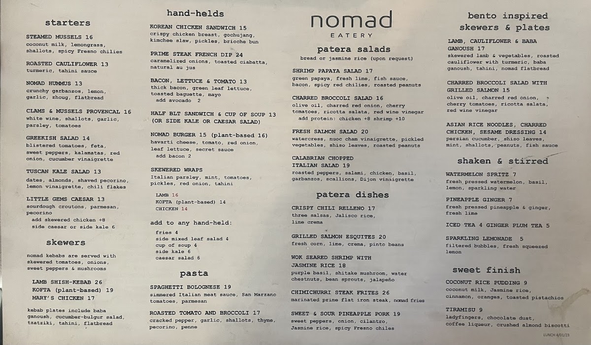 nomad kebobs are served with skewered tomatoes, onions & sweet peppers. plates include baba ganoush, cucumber-bulgar salad, tzatziki, tahini & flatbread.